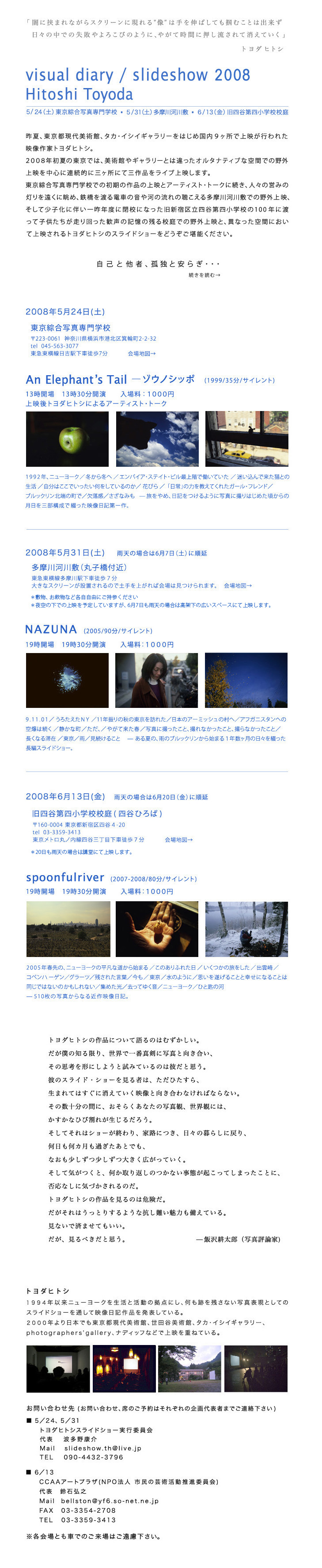 New Yorkと東京、美術館やギャラリーではないオルタナティブな空間でのトヨダヒトシ氏によるスライド上映ショー。多摩川河川敷などでも上映するそうです。気になる。